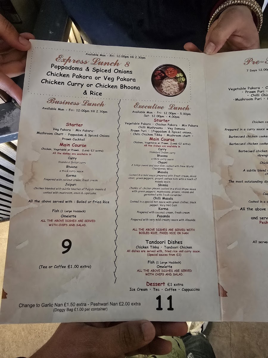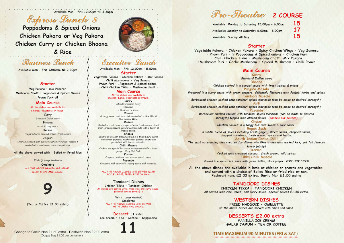 Veg pakora, Any 2x curries, Rice & naan (Excluding King Prawn) chicken Pakora 1.50 extra